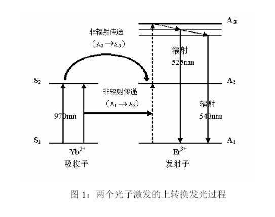 自然界中存在很多有機或無機物質(zhì),它們可以在電磁輻射激發(fā)下發(fā)射熒光或磷光,且在發(fā)光過程中遵守Stokes 規(guī)則,即發(fā)射光的波長長于激發(fā)光的波長。而在20 世紀70 年代,科學家們卻合成了一類可以反Stokes 規(guī)則產(chǎn)生磷光的特殊材料,即UCP。UCP 在紅外光區(qū)(波長>780nm)被激發(fā),卻可以發(fā)射波長遠短于激發(fā)光的可見光(波長475nm-670nm),即能量上轉(zhuǎn)換。物質(zhì)構(gòu)成決定性質(zhì)特點。UCP 是由稀土金屬元素摻雜于晶體的晶格中構(gòu)成的。在這種材料中有三種主要的成分:主基質(zhì)(Host Matrix)、吸收子(Absorber)和發(fā)射子(Emitter)。作為主基質(zhì)的晶體材料有:氧硫化物(如Y2O2S、GdO2S、La2O2S 等)、氟化物(如YF3、GdF3、LaF3 等)、鎵酸鹽(如YGaO3、Y3Ga5O12 等)以及硅酸鹽(如YSi2O5、YSi3O7 等)等;常用作吸收子的稀土金屬離子有:鐿離子(Yb3+)、鉺離子(Er3+)、釤離子(Sm3+)等;常用作發(fā)射子的稀土金屬離子有:鉺離子(Er3+)、鈥離子(Ho3+)、銩離子(Tm3+)、鋱離子(Tb3+)等。吸收子和發(fā)射子這一離子對在主基質(zhì)晶格內(nèi)適宜的空間取向和距離,是產(chǎn)生上轉(zhuǎn)換發(fā)光的基礎。上轉(zhuǎn)換發(fā)光的產(chǎn)生是一個涉及多個(至少兩個)光子的光學過程。在這個過程中(如圖1),UCP 內(nèi)的吸收子(如Yb3+)至少要吸收兩個低能量光子(紅外光區(qū),如970nm),而后經(jīng)過一系列內(nèi)部能量轉(zhuǎn)換,以非輻射的形式(A1→A2,A2→A3)將這兩個光子的能量連續(xù)傳遞給發(fā)射子(如Er3+),以使其處于激發(fā)態(tài)(A3)。后者接著發(fā)生一個返回基態(tài)能級的躍遷,釋放一個高能光子(可見光區(qū),如525nm 或540nm),完成能量上轉(zhuǎn)換。
